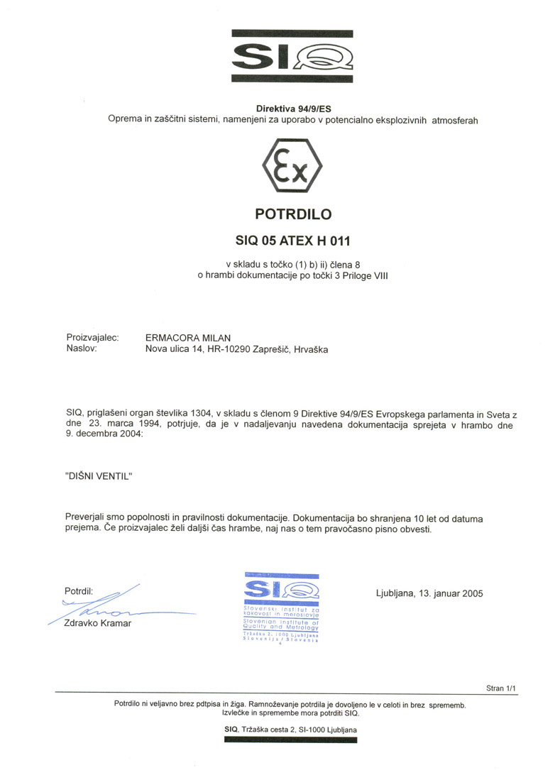 Dišni ventil – certifikat SIQ